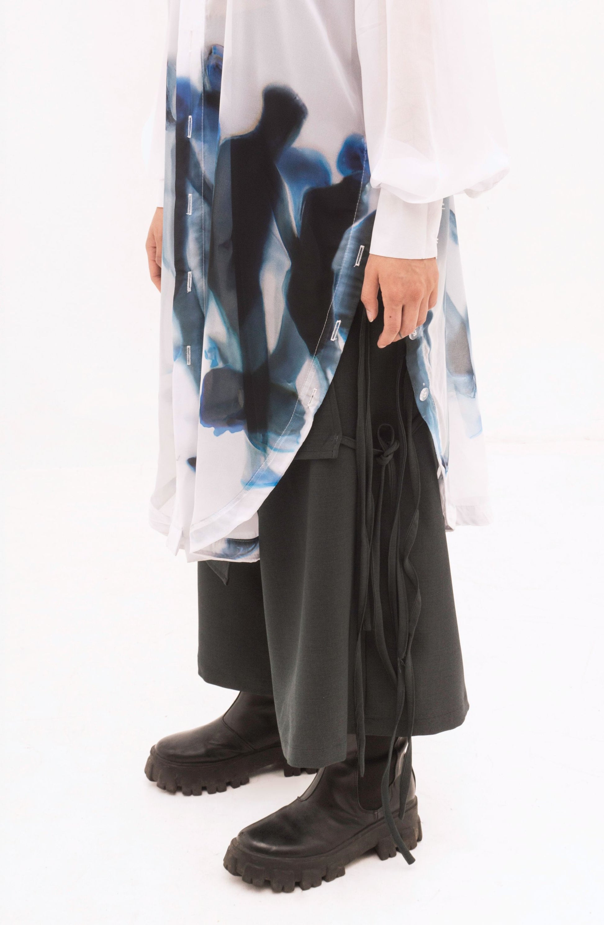 Camisa oversize con estampado analógico-digital creado a partir de archivos de vídeo y ondas sonoras de personas caminando por la calle. Botones ocultos en la parte delantera y sistema de cierre con botones en ambos lados.